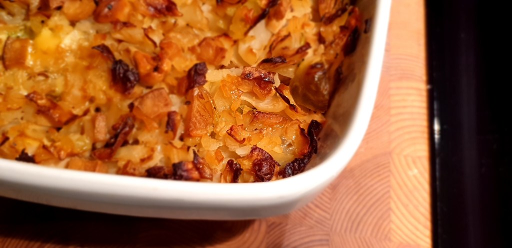 Liennyttääkseni ilmasto- ja muoviahdistusta kehittelin tuossa taannoin kasvisvaihtoehdon kaalilaatikolle. Toisinaan kasvisruo’ista puuttuu se jokin (ehkä umami?) mutta tästä löytyi sopivaa täyteläisyyttä.